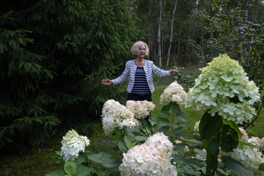 “Mana vājība ir rododendri. Dita, kad ieraudzīja, kā tie zied, teica: “Beidzot es saprotu, ko tu vari ņemties un auklēties ar šiem ziediem!” Man ir arī baltās akācijas, tās zied un smaržo, bet, kad nobirst, ir kā Imanta Kalniņa dziesmā “Akāciju palags”. Zeme ir balta un smaržo,” stāstītāja kļūst romantiska.