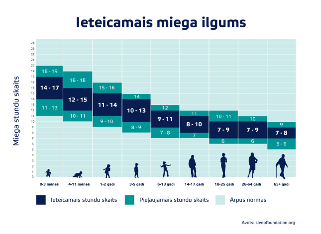 Tīņu vecumā veselīgi būtu naktī gulēt 8 – 10 stundas, jaunākiem skolas vecuma bērniem miegam būtu jāvelta 9 – 11 stundas. Svarīgi, lai nakts laikā ikviens izdzīvo vairākus miega ciklus.