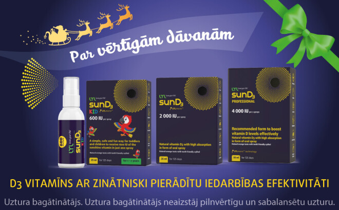 Negribot ļauties lielajam “pirkšanas-pārdošanas bubulim”, kas ātri vien var nosist arī svētku sajūtu, mēs redakcijā jau pērn vienojāmies, ka neskriesim kā traki pa veikaliem pēc nevajadzīgiem niekiem. Bet tas nenozīmē, ka iztiksim bez dāvanām, jo pati dāvināšana taču ir tik skaista! Nolēmām, ka dāvināsim cits citam ko tiešām vērtīgu. Varbūt paša radītu dzejoli kolēģim? Vai varbūt pāris stundu, lai iemācītu otram to, kas pašam labi padodas – kūku cepšana vai tamborēšana. Es kā vadītāja saviem darbiniekiem vēlu tikai vienu – labsajūtu un veselību! Pēc pašas pieredzes nu jau simtprocentīgi varu teikt, ka šis mazais, ērti lietojamais D3 vitamīna flakoniņš iemieso sevī gan labsajūtu, gan dzīvesprieku, gan veselību! Tāpēc, lai arī mazliet ar praktisku pieskaņu, nolēmu visam kolektīvam un arī saviem mīļajiem šogad svētkos zem eglītes likt LYLsunD3 - efektīvu uztura bagātinātāju, kas ir dabisks D3 vitamīns izsmidzināma spreja formā. Gan koncentrētā deva, gan īpašā mikroemulsijas forma izskaidro, kāpēc efekts jūtams pārsteidzoši īsā laikā - vitamīna šķidrā forma garantē pārliecinošu un ātru vitamīna uzsūkšanos organismā. Sprejs jāiesmidzina mutē zem mēles, vai vaiga iekšpusē, kur gļotāda ir bagāta ar neskaitāmiem kapilāriem. Tas nodrošina D3 vitamīna momentānu uzsūkšanos, caur asinsvadiem nogādājot to asinsrites sistēmā. Tiek apiets kuņģa-zarnu trakts, kur vitamīna uzsūkšanās ir traucēta. LYLsunD3 pieejams trīs veidos - normāla D3 vitamīna līmeņa uzturēšanai ir LYLsunD3 2000SV, nepietiekamības un deficīta novēršanai – LYLsunD3 4000SV. Trešais, LYLsunD3 KID ir drošs, ērts un garšīgs D3 vitamīna uzņemšanas veids mazajiem ķipariem no 1 līdz 7 gadiem. LYLsunD3 flakoniņš nav jāuzglabā īpašos apstākļos, to ērti var ņemt līdzi somā un lietot jebkurā dienas brīdī. Manās mājās tas stāv priekšnamā, un visa ģimene, pirms došanās savās gaitās, uzņem savu dienas veselības devu. Vēl būtiski divi faktori – šī produkta sastāvā kā saldinātājs ir izmantots dabiskais ksilīts, kas labvēlīgi ietekmē zobu veselību. Un otrs - LYLsunD3 flakoniņš pietiek veseliem 4 aktīvas lietošanas mēnešiem, līdz ar to tas arī ir finansiāli izdevīgs un prātīgs pirkums.