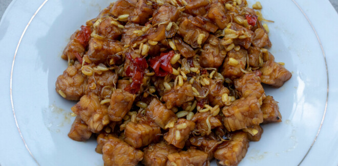 400 g Tampe – kraukšķīga tofu, ko var atrast lielveikalos vegānu plauktā