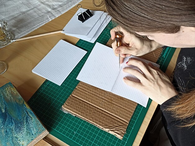 Pirmais posms Ilzes darbā ir papīra izvēle, tad seko saspiešana, lai piezīmju grāmatiņa vai blociņš būtu kompaktāks un vieglāk apstrādājams. “Ir šūšanas stili, kur papīra saspiešana nav vajadzīga. Mans piezīmju grāmatiņu taisīšanas stils ir “Art Books”, kas vairāk ir mākslinieciskās grāmatas.