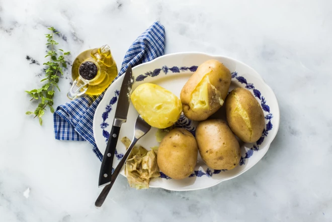 Kartupeļus rūpīgi notīri un nomazgā, vislabāk ar suku. Liec verdošā sālsūdenī un izvāri mīkstus. Nokās, gareniski iegriez un iekaisi dažus jūras sāls graudiņus.