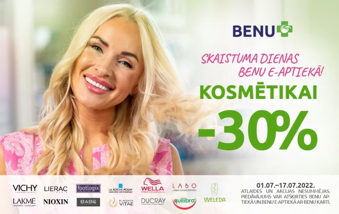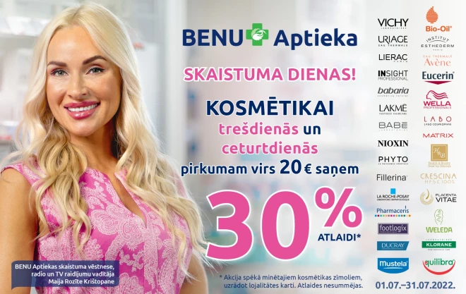 Tāpat jūlijā BENU Aptiekās visā Latvijā trešdienās un ceturtdienās – Skaistuma dienas! Dodies uz tev ērtāko BENU Aptieku un kosmētikas pirkumam virs 20 eiro saņem 30 % atlaidi!