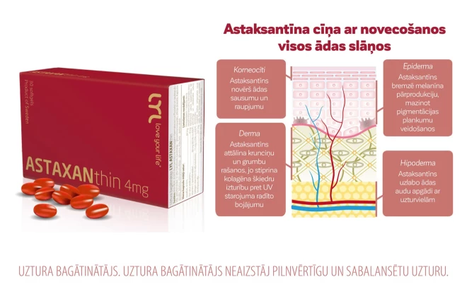 Atradu arī, ka Latvijā šis pats farmācijas uzņēmums piedāvā astaksantīna sejas – kakla, acu un roku krēmus, kurus ieteicams lietot kompleksi kopā ar kapsulām, lai palīdzētu izlīdzināt grumbas, samazināt pigmentācijas plankumus un uzturēt ādas mitruma līmeni gan vīriešiem, gan sievietēm.