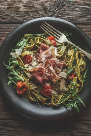 10. Makaroniem lieku klāt gan sablenderēto masu, gan otru pusi ar tomātiņiem un prošuto gabaliņiem.