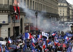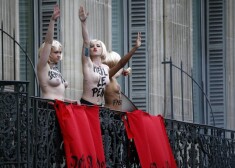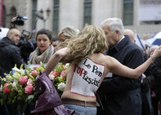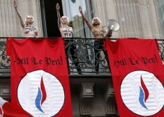 Puskailas radikālās feministu organizācijas "Femen" aktīvistes 2015.gada 1.maijā Parīzē sarīkojušas protestu pret Francijas galēji labējās partijas Nacionālā fronte (FN) līderi ...