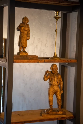 “Šis koks ir nācis no istabiņas, kurā mans tētis piedzima, jo tolaik sievietes nebrauca uz dzemdību namiem. Tādēļ arī Laurai šīs senās durvis ir tik sentimentāli svarīgas,” atklāj Liene. Divas koka figūriņas, sieviņu un vīriņu, kafejnīcai uzdāvinājusi kāda vietējā iedzīvotāja, viņai jau pāri sešdesmit, bet bērnībā ar tām spēlējusies. Tualeti izdaiļo senas slēpes, jo Bernāti ir brīnišķīgs ziemas kūrorts. Šīs slēpes arī uzdāvinājusi kāda apmeklētāja, tās ar rokām darinājis viņas vectēvs.
