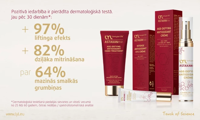 LYL ASTAXANThin dermokrēmu efektivitāte ir pierādīta testos: 97% uzlabojas liftinga efekts, par 82% dziļāka mitrināšana, par 64% mazinās smalkās grumbiņas. Turklāt šī jaudīgo anti-aging vielu saturošā kosmētika ir radīta tieši Latvijā un pagaidām aptieku plauktos ir vienīgā.