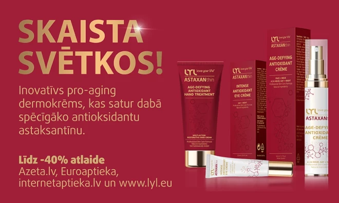 Izrādās, mūsu aptiekās astaksantīnu tīrā un dabiskā veidā piedāvā vietējais farmācijas zīmols LYL love your life® kā uztura bagātinātāju LYL ASTAXANthin iekšķīgai lietošanai un ārīgai – dermokrēma ASTAXANthin Age-Defying Antioxidant Crème sejas un kakla ādai, ādai ap acīm LYL ASTAXANthin INTENSE ANTIOXIDANT EYE CRÈME un roku ādai domāta krēma – maskas LYL ASTAXANthin Age Defying Antioxidant Hand Treatment veidā.