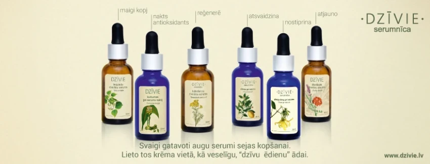 Latvijā ražo augu un ziedu serum-krēmus: dabīgi, svaigi gatavoti, nekarsēti, tie nesatur ūdeni, tikai aktīvās vielas. Enerģijas lādiņš ādai jebkurā vecumā.