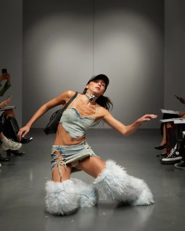 AVAVAV dizainere Beāte Karlsone ne tikai piedāvā praktiski nevalkājamus apavus, bet arī demonstrē pārvietošanās iespējas tajos – krist. Skatei iestudētā modeļu krišana bija domāta kā parodija par pārnopietnajām modes skatēm ar modeļu akmens cietajām un skarbajām sejas izteiksmēm, “par modes mākslīgumu, par bagātības viltošanu, kas ir risks izgāzties”.