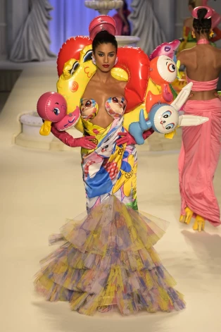 Iedvesmojoties no Lielbritānijas konservatīvā politiķa Kvasi Kvartenga un inflācijas problēmām, Moschino radošais direktors Džeremijs Skots prezentēja tērpus, kas burtiski un pārnestā nozīmē ļaus “noturēties virs ūdens” jeb tērpus, kas ir piepūšami.