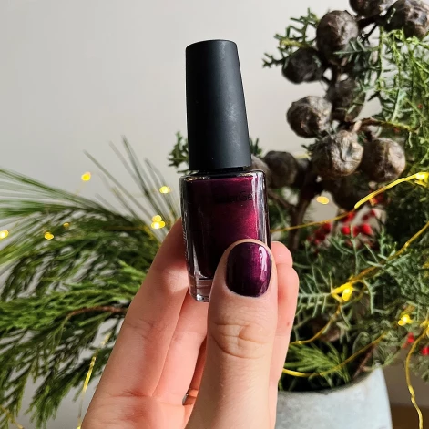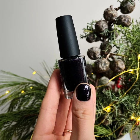 Šī nagu laka, uzklāta uz naga, pirmajā acu uzmetienā robežojas ar gandrīz melnu. Tumšākā apgaismojumā tāda tā varētu arī šķist, kaut patiesībā ir tumši violeta. Tai klāt arī pievienoti krāsaini, smalki, mirdzoši putekļi, kas toni padara svinīgu un cēlu. Novērojumi praksē pieradādījuši, ka nagu lakas, kurās iestrādāti šādi mirdzumi, ir noturīgākas un tāpēc arī nedaudz grūtāk noņemamas. Arī šī laka nav izņēmums. Pateicoties spīdumiem, tā arī ļoti pateicīgi klājas uz naga, tāpēc būs drošāks variants, ja roka nav ietrenēta nagu krāsošanai mājas apstākļos.