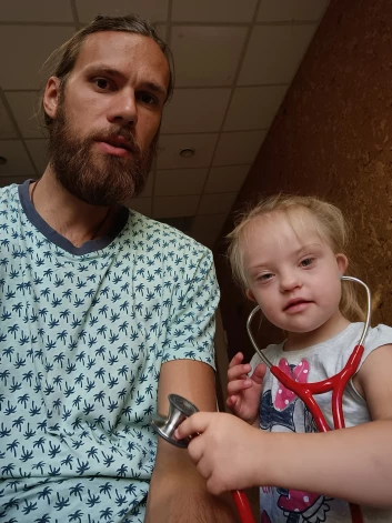 Bet viņa ir ļoti aktīva, sabiedriska. Mums liels prieks, ka vismaz pagaidām viņai nav autisma pazīmju, kas bieži gadās kopā ar Dauna sindromu. Meita attīstās un priecē mūs un apkārtējos.”