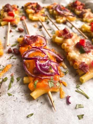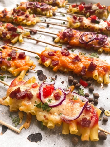 3. Kad visi makaroni sadurti uz iesmiņiem, liek tos uz cepamplāts, kas izklāta ar cepampapīru. Katru iesmiņu apziež ar tomātu mērci vai kečupu, pārkaisa sarīvēto sieru, uzber garšvielas, kādas vēlas, ber virsū tomātus, papriku, desu vai šķiņķi un vēlreiz pārkaisa ar sieru. Pa virsu uzliek sīpola ripiņas.