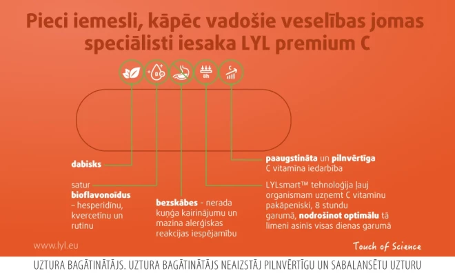 Es ieteiktu izvēlēties bezskābes C vitamīnu LYL premium C. Šim produktam ir ilgstoša iedarbība, respektīvi, pateicoties īpašai tehnoloģijai, tas organismā uzsūcas pakāpeniski, garantējot augstāko iedarbības efektivitāti: uzņemts no rīta, C vitamīns turas optimālā līmenī asinīs visas dienas garumā jeb astoņas stundas. Turklāt LYL premium C ir ne tikai draudzīgs kuņģa gļotādai, jo nepieļauj kairinājumu, bet arī papildināts ar bioflavonoīdiem – hesperidīnu, kvercetīnu un rutīnu –, kas ne tikai palīdz šim vitamīnam uzsūkties organismā, aizkavē tā oksidēšanos un sekmē šūnu elpošanu, bet arī ir labs atbalsts asinsvadiem, līdz ar to arī sejas ādai. Svarīgi, ka LYL premium C ir dabisks, nesatur konservantus un dzīvnieku valsts izejvielas, sintētiskas piedevas, tāpēc ir piemērots gan alerģiskiem cilvēkiem, gan veģetāriešiem, gan vegāniem.