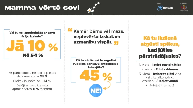 “Kā šobrīd jūtas mammas Latvijā? Īsā atbilde ir: lielākā daļa atbildības un pienākumu par mājas un bērnu lietām ir uz mammu pleciem un viņām katastrofāli pietrūkst laika sev. Fiziski un emocionāli par sevi parūpējas ap 10–13 % mammu. Tas ir ļoti maz!” pārsteigumu par Mammu aptaujas rezultātiem pauž kognitīvi biheiviorālā psihoterapeite un aptaujas līdzautore Sabīne Bērziņa.