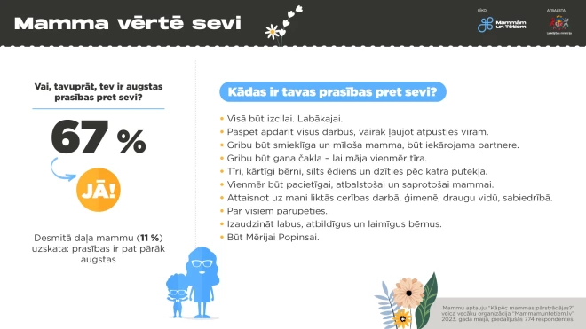 “Kāpēc tik liela atbildība ir tieši uz mammu pleciem? Pagaidām no aptaujas datiem varam secināt, ka mammām ir augsti standarti pret sevi (68 %) un arī par to, kādai jābūt labai ģimenei (57 %). Mammas raksta, ka “visā gribu būt izcila, labākā”, “gribu būt smieklīga un mīloša mamma, būt iekārojama partnere”, “gribu labi pelnīt”, “gribu būt gana čakla – lai māja vienmēr tīra, lai tīri, kārtīgi bērni, silts ēdiens”, “gribu attaisnot uz mani liktās cerības darbā, ģimenē, draugu vidū, sabiedrībā”. Tāpat kāda mamma norāda, ka grib būt Mērija Popinsa – tātad visu varoša un visus laimīgus daroša,” aptaujā gūto informāciju atstāsta vecāku organizācijas “Mammamuntetiem.lv” vadītāja Inga Akmentiņa-Smildziņa. “Sanāk tā: mammas tik daudzās jomās grib būt perfektas, ka dienas laikā pietrūkst stundu.”