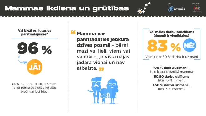 96 % mammu atbild ar jā. Turklāt 74 % no tām ir jutušās pārstrādājušās bieži vai pat ļoti bieži. Kas zīmīgi, 85 % respondentu teic, ka lielākā daļa atbildības un pienākumu par mājas un bērnu lietām ir mammai – vienlīdzīgs ikdienas darbu dalījums ir tikai 13 % ģimeņu, uzskata mammas. Vienlaikus katra otrā mamma prasot palīdzību ikdienas darbu veikšanā un viņai tā tiek dota, tomēr laika, lai rūpētos par sevi, mammām ir ļoti maz – no 15 minūtēm līdz stundai.