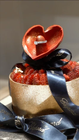 "Vincents" talantīgā konditore, ukrainiete Irina Voroņenko, iedvesmojoties no "Chopard Ice Cube" saderināšanās kolekcijas un pasaulslavenā franču konditora Amorija Ģišo, ir radījusi unikālu desertu, kurā meistarīgi iestrādājusi saderināšanās gredzenu.