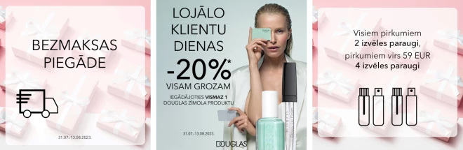 Jau deviņus gadus interneta veikals Douglas.lv rūpējas par Tavu skaistumu un labsajūtu. Dzimšanas dienas svinību laikā (31.08.-13.08.23.) vēlamies Tevi iepriecināt ar lieliskiem piedāvājumiem: atlaidēm, dāvanām par pirkumu un bezmaksas piegādi.