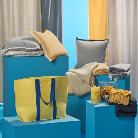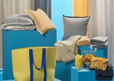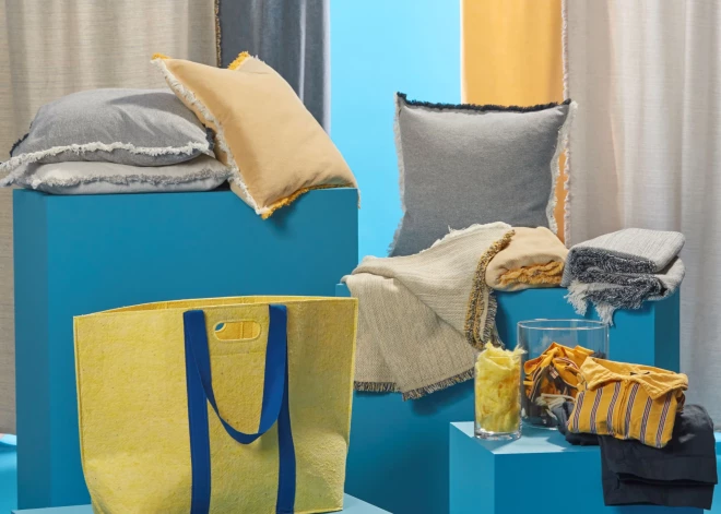 Aizkari, spilvenu pārvalki, pledi un somas - IKEA jaunā kolekcija, kas gatavota no darbinieku formastērpiem