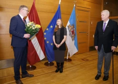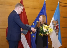 Rīgas domes vadība godina rīdzinieci Sanitu Kacubu, kura aizvadītā gada nogalē palīdzēja atgūt ļaundaru nolauzto taktilā Brīvības pieminekļa obelisku.
