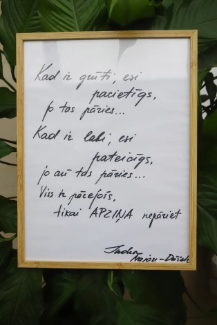 Priekšlaicīgas dzemdības un... tā sanāca. Bet šī dzīves daļa mani ļoti ietekmēja un veidoja. Un man šķiet, ka dzīvē nekas nenotiek nejauši, katra situācija, katrs notikums uz kaut ko ved. Arī mana nonākšana Hospiss Māja nav nejaušība, kaut kāds uzdevums man ir dots. Varbūt tāpēc es šeit jūtos ļoti brīvi, nekāds smagums mani nenospiež. Bet varu pačukstēt, ka daudzi mūs visus uzskata par ļoti jocīgiem cilvēkiem, kuri pinas ar nāvi, taisa savu melno biznesu. Feisbukā tādu komentāru ir gana daudz. Tikai ko tad tu, komentētāj, esi sadomājies – ka pats nekad nemirsi? Un ja tev, gaidot pēdējo stundiņu, būs pagalam slikti, pie mums pēc palīdzības nevērsīsies? Vērsīsies! Jautājums tikai, kurā brīdī tu atzīsi, ka nāve tuvojas, un to pieņemsi. Pieņemšana, piedošana ir atslēgas vārdi, kas grozās ap šo notikumu.