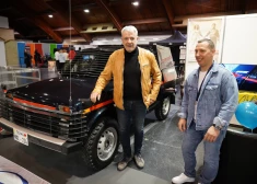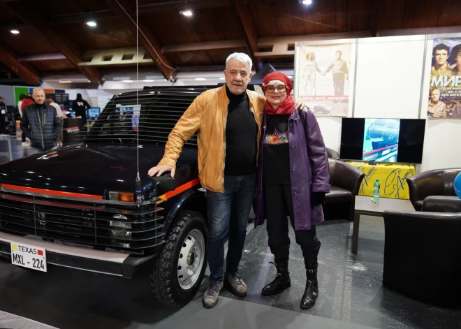 Mirdza Martinsone un Mārtiņš Vilsons ar kinofilmas "Mirāža" auto