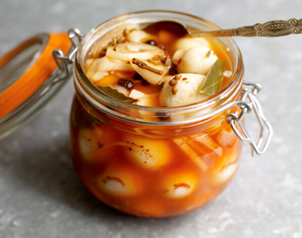2. Liec novārītās olas sterilā stikla burkā, lej virsū marinādi, noslēdz un liec ledusskapī marinēties vismaz 24 stundas.
