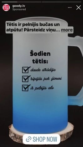 "Tētis ir pelnījis bučas un atpūtu!" vēstī kāda internetveikala reklāma, aicinot iepriecināt savu tēti Tēva dienā. Tālāk rotaļīgā veidā uzskaitītas trīs lietas, kas ir attiecināmas uz tēti - šodien tētis ir daudz strādājis, rūpējies par ģimeni un pelnījis alu. Teksts, kurš no pirmā acu uzmetiena var šķist nevainīgs, tomēr daudzos ir raisījis pretrunīgas izjūtas un mudinājis aizdomāties - vai tiešām Tēva dienas svinēšana ir saistāma ar alkoholu?