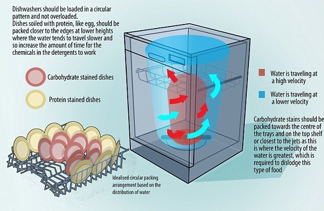 Tas nozīmē, ka traukus, kuri klāt ar piekaltušu ēdienu, jo īpaši – sakaltušiem ogļhidrātiem (makaroni, kartupeļi, rīsi), ir jānovieto visstiprākās ūdens plūsmas zonā. Savukārt tuvāk trauku mašīnas sānu malām un apakšējā līmenī vislabāk nomazgājas šķīvji un bļodiņas, no kurām ēstas olbaltumvielas. Piemēram, olu dzeltenums, olmete, biezpiens utml. Pētnieki norāda, ka kartupeļu ēdieni, tomato mērces un tomatu paliekas labi nomazgājas arī bez speciāliem trauku mazgājamajiem līdzekļiem. Tiem pietiek ar spēcīgu ūdens strūklu. Turpretim olu dzeltenumu nomazgāšanai ir nepieciešams trauku mazgājamais līdzeklis. Tāpēc nereti ne visi trauki, kas ir mazgāti vienā mazgāšanas ciklā, ir vienādi tīri.