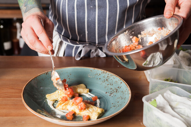 4. Gatavās omletes pankūkās liec maskarpones un zaļumu krēmu un ātri aizrullē.