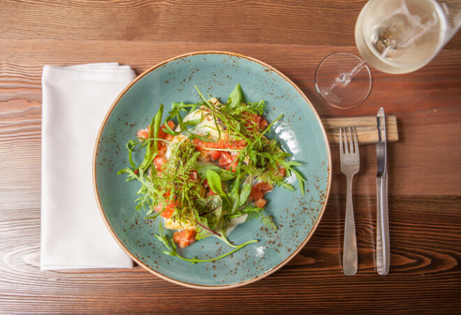 Omletes rullīši ar tomātu salsu, salātiem un šampanieti