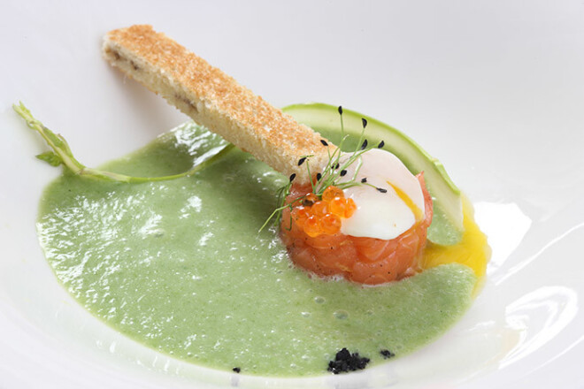 Sparģeļu aukstā zupa ar laša tartaru