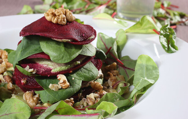 3. Kārto tornī biešu šķēles, pa vidu katrām divām šķēlēm liekot karoti siera. Rotā ar maziņām spinātu lapām un valriekstiem.