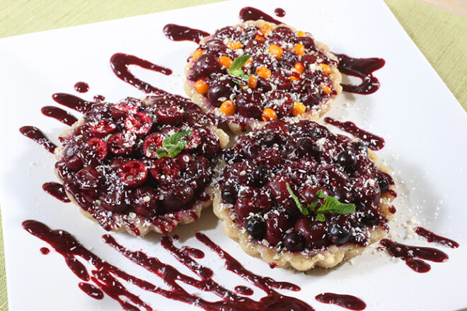 4. Izņem formītes no ledusskapja, no formītēm izņem groziņus un tajos pa apli kārto dehidrētos ķiršus. Rotā ar saldētam ogām (smiltsērkšķiem, upenēm), svaigām dzērvenēm un piparmētrām.