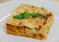 Cepamtraukā ar zupas kausu lej mērci. Tai pa virsu liek četras lazanjas plāksnes, ko pirms tam pa vienai izmērcē karstā ūdenī. Tad liek sacepto pildījumu. To pārlej ar mērci, kam virsū liek izmērcētas lazanjas plāksnes un pildījumu. Šādā veidā atkārto vēl reizi un pēdējās liek lazanjas plāksnes, ko pārlej ar mērci. Liek cepties 180 grādos uz 30 minūtēm. Tad izvelk no cepeškrāsns, pārkaisa ar sieru un liek cepties vēl apmēram uz 5 minūtēm, kamēr siers skaisti apbrūnē. Kad gatavs, ļauj nedaudz atdzist. Griež 8 gabalos. Uzmanīgi liek uz šķīvjiem un rotā ar svaigu baziliku.
