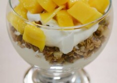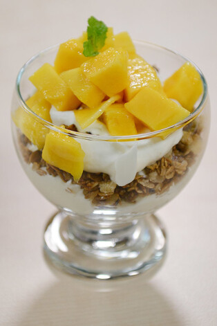 Augļa mīkstumu sagriež mazos kubiciņos. To ērti var izdarīt, pārgriežot mango uz pusēm, izņemot kauliņu, iegriežot līdz pat mizai rūtiņas. Tad izvērš mango mizu uz otru pusi tā, ka sagrieztās rūtiņas veido kaut ko līdzīgu ezim. Šo augļa mīkstumu ērti nogriezt. Sviestā apcep auzu pārslas, pievieno cukuru. Kad tas sāk karamelizēties, liek uz cepampapīra atdzesēties. Saputo saldo krējumu, tam piejauc apceptas auzu pārslas, sasmalcinātus valriekstus un daļu mango. Traukā kārto putukrējuma masu. Rotā ar mango gabaliņiem un grauzdētajām auzu pārslām.