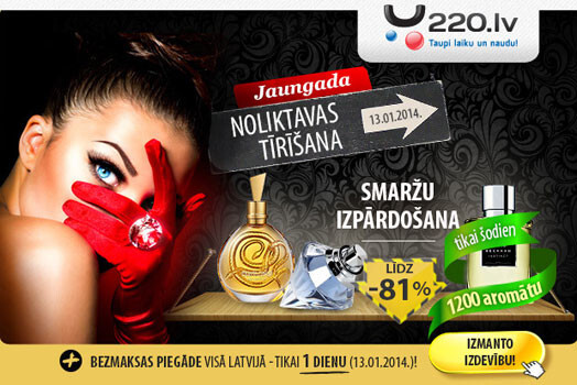 Tikai šodien 13.01.2014. interneta veikalā 220.lv, līdz plkst. 23.59 (pēdējais rezervācijas brīdis 220.lv lapā) nopērkamas zīmolu smaržas ar SUPER atlaidēm līdz -81% + tiek nodrošināta BEZMAKSAS piegāde uz mājām vai jebkuru citu adresi Latvijā!