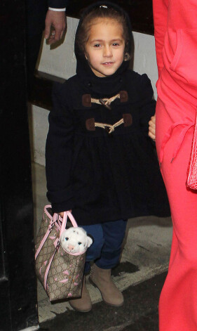 Mazajai meitenei jau ir kleitas visās iespējamās krāsās no franču bērnu luksusa zīmola Bonpoint, 300 britu mārciņas vērtas zeķbikses no Chloe, Stella McCartney zābaki un, protams, šiem komplektiem pieskaņotas matu stīpiņas. Tomēr ir arī pozitīvais aspekts – meitas valkātās drēbes ģimene ziedo labdarībai.