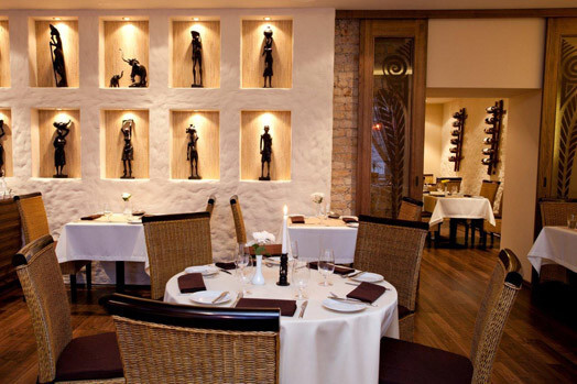 Ēdienkarte šeit ir dalīta. Liela daļa ir Āfrikas ēdieni, daļa – starptautiski pazīstami, piemēram, Cēzara salāti un karpačo. Bet, protams, šurp ir vērts doties, lai nobaudītu tieši Āfrikas garšas, un tas ir lielisks piedzīvojums. Šefpavārs Artūrs Guziks eksperimentē, piedāvājot Āfrikas ēdienus ar modernās virtuves niansēm, apvienojot gan pašmāju, gan no Āfrikas vestus produktus: plantānus, krokodila gaļu, garneles, kafiju un šokolādi. Pamata ēdienkartē, kas ik pa laikam mainās, pieejamas ļoti īpašas zupas, piemēram, asā Āfrikas zupa ar tīģergarnelēm, vistas fileju, garnelēm un Poku sēnēm (Ls 5,50) vai Bouillabaisse ar lasi, Nīlas asari, kalmāru, tīģergarnelēm un melnajām mīdijām (Ls 5,95). Plašs auksto un karsto uzkodu (Ls 4,90 – 9,30) un salātu klāsts (Ls 4,80 – 5,90). Interesantas ir tīģergarneles Āfrikas klasiskajā peri-peri mērcē (Ls 7). Ēdienkartē, protams, ir zivju un gaļas ēdieni, un afrikāniski kārdinoša vienmēr ir kāda no dienas zivīm (cena mainīga) vai grilēts strausa filejas steiks (Ls 16,50). Blakus pamata kartei tiek sniegts speciālais piedāvājums, vienmēr tikai ar Āfrikas garšām, piemēram, kokospiena zupa ar karaliskajām garnelēm (Ls 8), Āfrikas piparos grilēts steiks (Ls 9,50), krokodila fileja (Ls 23) un Dienvidāfrikas trijotne desertā (Ls 5,70).