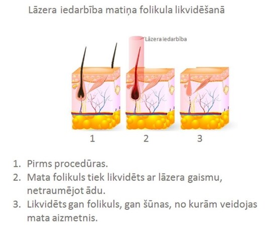 Lāzers izstaro augstākās jaudas monohromatisku gaismu (gaismu ar vienu viļņu garumu) un iedarbojas pēc selektīvas fototermolīzes principa, t. i., mērķtiecīgi iznīcina ne tikai matu folikulu, bet arī apkārtējās šūnas, no kurām veidojas mata aizmetnis. Tādā veidā tiek panākta ilgstoša matu augšanas apturēšana.