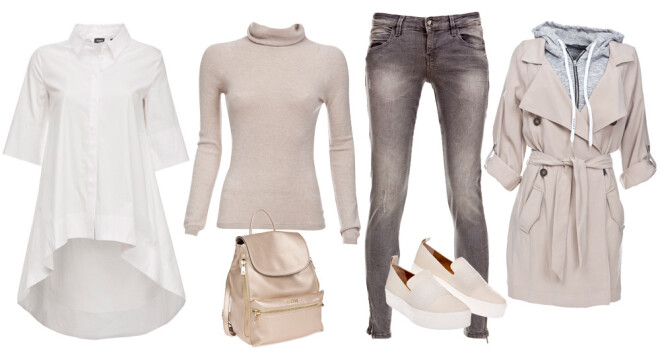 Mugursoma - roku brīvībai, metāliskā krāsa - aktuāls akcents. Trencis ar divrindu pogām, balināti džinsi, brīva blūze un apavi uz platformas ir moderns un 2017.gadā aktuāls komplekts.
