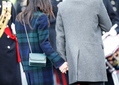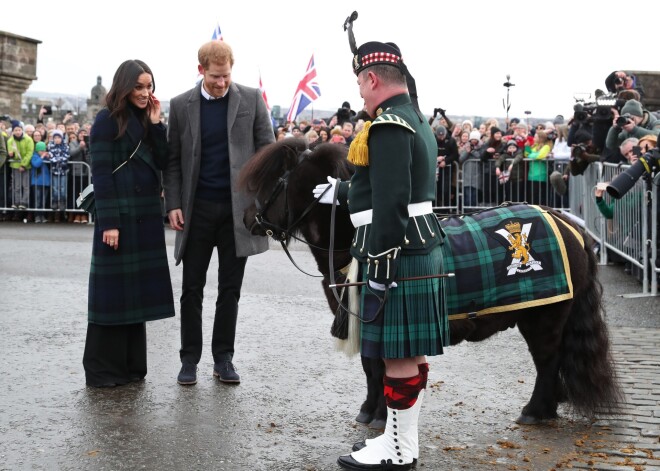 Izrādot godu par Skotijas galvaspilsētu dēvētajai Edinburgai, prinča Harija līgava aktrise Megana Mārkla bija ģērbusies rūtainā mētelī, ko darinājis britu zīmols „Burberry” ($ 2 895). Vizītei Skotijā viņa izvēlējusies garās bikses ar platiem galiem no zīmola „Veronica Beard” kolekcijas ($ 297), bet koptēlu papildinājusi ar mazu glītu pleca somiņu, ko darinājis zīmols „Strathberry”.