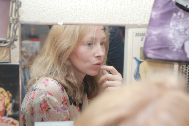 Aktrisei uz spoguļgalda daudz mīļu lietiņu, uz kurām sarunas laikā šad un tad paskatīties. Visādi nieki, dāvanas, Pjero statujiņa, The Beatles puišu foto, vēl kāda plate… Arī mammas un tēta foto. Tas rada drošības sajūtu, pazīstamu vidi, kur piesēst uz dažām minūtēm un gūt mieru.