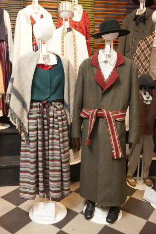 Tautastērpu centrā Senā klēts samērā nelielā telpā skatāmi desmitiem tērpu, un par katru no tiem ir savs stāsts. Tur, piemēram, ir impozantā Rīgas tautastērpa jaciņa – sarkana ar melnām vilnas šķipsniņām. Ziedīte domā, ka tā varētu būt atsauce uz karaļu lāsumainajām mantijām, kuras darināja no baltām sermuļādām ar melniem astu galiņiem.
