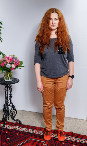 Gaiši zilā blūze ir sveiciens aktuālajām modes tendencēm, bet brīva piegriezuma sarkanās bikses – lai pasvītrotu personības būtību un vienlaikus pievērstu uzmanību valkātājai. Savukārt baltās tenisa čības ir kā mudinājums pievērsties veselīgam dzīvesveidam – pastaigām.