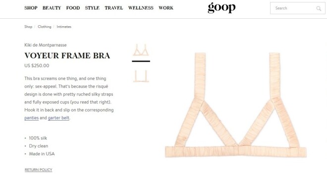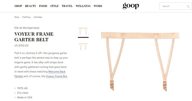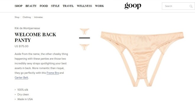 Holivudas aktrise Gvineta Paltrova (46) savā dzīvesstila mājaslapā „Goop” piedāvā zīda apakšveļas komplektu. Krūšturis, ko pat grūti par tādu nosaukt, potenciālajai klientei izmaksās vērā ņemamu summu - 250 ASV dolāru. Turklāt to nedrīkst mazgāt ar rokām, atļauta vien sausa ķīmiskā tīrīšana.