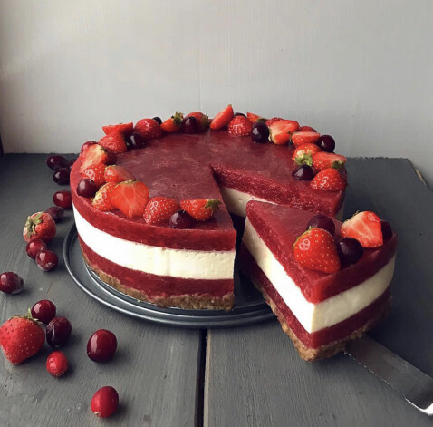 4. Sarkanā kārta. Pēc stundas uzbriedina un karstā ūdens peldē izkausē atlikušo želatīnu. To pievieno atlikušajai zemeņu masai. Lej pēdējo kārtu uz kūkas. Liek atpakaļ ledusskapī uz pāris stundām. Dekorē augļiem un ogām.